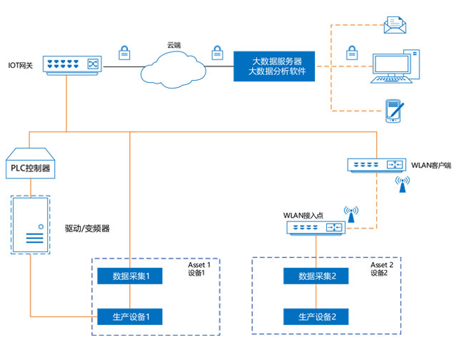 當(dāng)數(shù)字化工廠中的各條智能流水線已經(jīng)可以正常運(yùn)行,我們是否可以高枕無憂地宣告智能制造的工作結(jié)束了呢?答案當(dāng)然是否定的,數(shù)字化工廠中的每一臺設(shè)備都有著一定的生命周期,一旦某個核心設(shè)備出現(xiàn)故障,將面臨著停線停產(chǎn)的風(fēng)險,智能制造的另一大作用體現(xiàn)在其最后一個路徑也是智能制造的最高境界:增值服務(wù)。增值服務(wù)利用大數(shù)據(jù)和云計算技術(shù)提供基于數(shù)據(jù)的增值服務(wù),例如預(yù)防性維護(hù)。工業(yè)環(huán)境中廣泛會用到工業(yè)機(jī)器人,工業(yè)機(jī)器人的常見故障有:伺服焊槍斷裂、電纜斷裂、接線松動、減速機(jī)故障等。為了避免這些故障發(fā)生,提前監(jiān)控與預(yù)判, 可添加智能傳感器對振動,電流等關(guān)鍵參數(shù)進(jìn)行監(jiān)控。將監(jiān)測的機(jī)器人設(shè)備的數(shù)據(jù)進(jìn)行采集,通過現(xiàn)場總線和無線通信等技術(shù)將數(shù)據(jù)收集保存在IOT網(wǎng)關(guān),然后上傳到云端,通過大數(shù)據(jù)服務(wù)器和大數(shù)據(jù)分析軟件,對監(jiān)控機(jī)器人的狀態(tài)進(jìn)行預(yù)防性維護(hù),如有超過設(shè)定警戒值或閾值的異?,F(xiàn)象,可通過郵件、短信和可視化界面的形式告知,從而大大降低維修資源和停機(jī)時間,提高設(shè)備OEE。