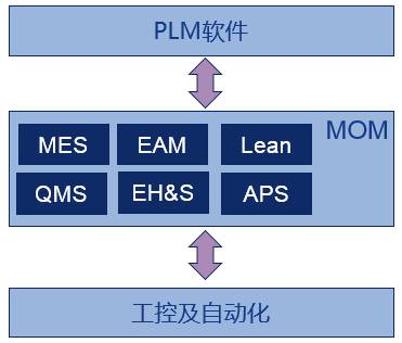在智能制造的技術(shù)支撐下,MES系統(tǒng)慢慢向制造運(yùn)營管理系統(tǒng)(Manufacturing Operation Management,簡稱MOM)過渡。MOM不僅包括MES,也包括EAM企業(yè)資產(chǎn)管理,LEAN精益,QMS質(zhì)量管理系統(tǒng),APS高級排產(chǎn)系統(tǒng),EH&S環(huán)境衛(wèi)生與安全等,是一個集成的軟件平臺,向上連接PLM軟件, 向下連接工控及自動化系統(tǒng),起到了鏈接PLM與自動化的橋梁作用。此外,MES是車間級的或者是工廠級的,服務(wù)于企業(yè)管理的一個“孤島”, MOM是延伸到上下游產(chǎn)業(yè)鏈,聯(lián)用戶、聯(lián)外部資源商的集成的制造運(yùn)營管理系統(tǒng),是企業(yè)間的連接。