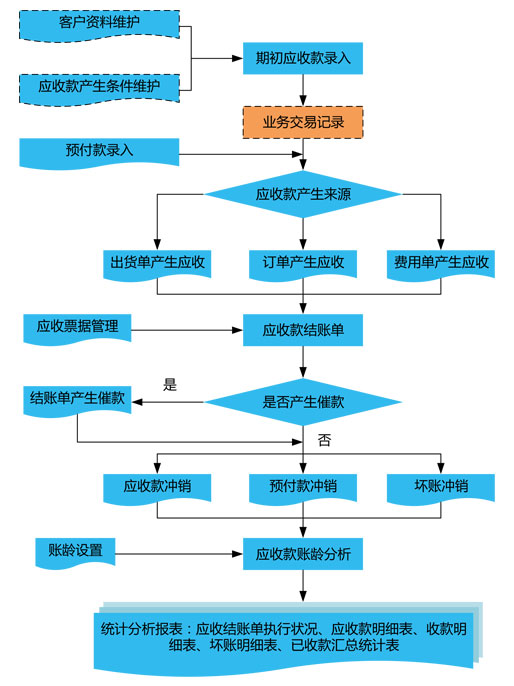 主要功能包括應(yīng)收賬款期初開帳,根據(jù)客戶資料設(shè)定的發(fā)票類型、結(jié)算方式、收款方式、幣別匯率等條件自動生成應(yīng)收帳款,并可根據(jù)需要產(chǎn)生催款單、費用單,對特定無法處理的應(yīng)收款還可生成壞帳單作為壞帳處理;系統(tǒng)支持預(yù)收款管理,并提供預(yù)收款手工沖銷和自動沖銷兩種模式。系統(tǒng)提供大量跟蹤分析統(tǒng)計報表,如應(yīng)收賬款執(zhí)行狀況、應(yīng)收款明細表、收款明細表、壞帳明細表、已收款匯總統(tǒng)計、綜合分析、帳齡分析等。