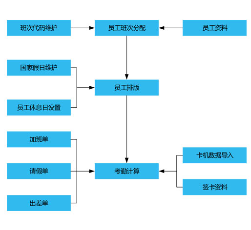 考勤管理:從卡鐘采集每日員工打卡原始數(shù)據(jù),結(jié)合公司的各種管理制度,進行考勤數(shù)據(jù)的異常統(tǒng)計分析,得出員工的每月考勤數(shù)據(jù)。