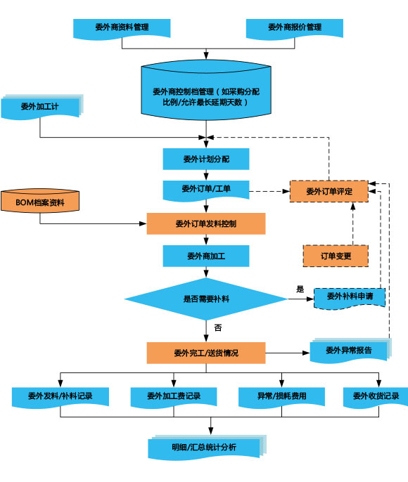 委外單管理:系統(tǒng)可根據(jù)委外計劃自動生成委外加工單,并實時跟蹤委外單的發(fā)料情況和完成進度。如因最小包裝等原因,必須多發(fā)物料給委外商,系統(tǒng)提供多發(fā)倉管理,自動記錄多發(fā)料情況,下次發(fā)料時自動扣減應(yīng)發(fā)料數(shù)量。