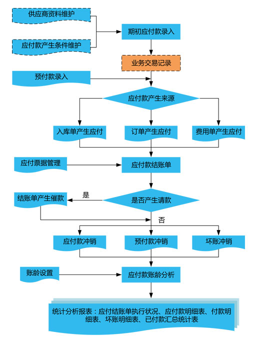 主要功能包括應(yīng)付賬款期初開帳,根據(jù)供應(yīng)商資料設(shè)定的發(fā)票類型、結(jié)算方式、付款方式、幣別匯率等條件自動生成應(yīng)付帳款。系統(tǒng)支持預(yù)付款管理,并提供預(yù)付款手工沖銷和自動沖銷兩種模式。系統(tǒng)提供大量跟蹤分析統(tǒng)計報表,如應(yīng)付賬款執(zhí)行狀況、應(yīng)付款明細表、付款明細表、資金平衡分析、帳齡分析等。